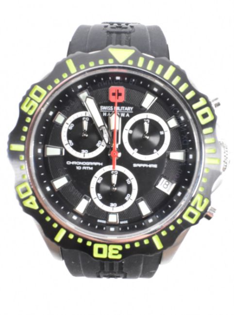 A Hanowa Military Chronograph gentleman's wrist watch. The watch having a round face with baton numerals to the chapter ring and three subsidiary dials. The watch set within a stainless steel case and rubber strap. Case measures approximately 4.5cm diameter. In original box.