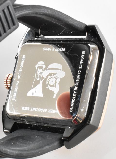 A Swan and Edgar 9098 automatic chronograph wrist watch. The watch having a square black face, three subsidiary dials, date aperture to three and white baton markings to the chapter ring. The watch having a rose gold tone bezel, black case and rubber strap. Case measures 48mm. Set within original box.
