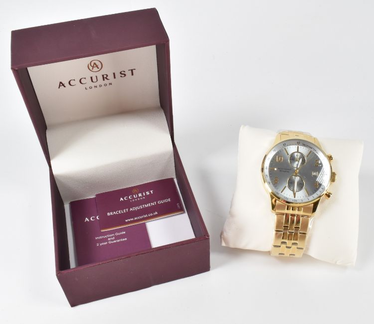 A gentleman's Accurist 7377 stainless steel chronograph watch. The watch having a silver sun burst face with two subsidiary dials, date aperture to three, tachymeter scale, set within a gilt stainless steel case on a bracelet strap. Case measures 46mm. Set within original box.