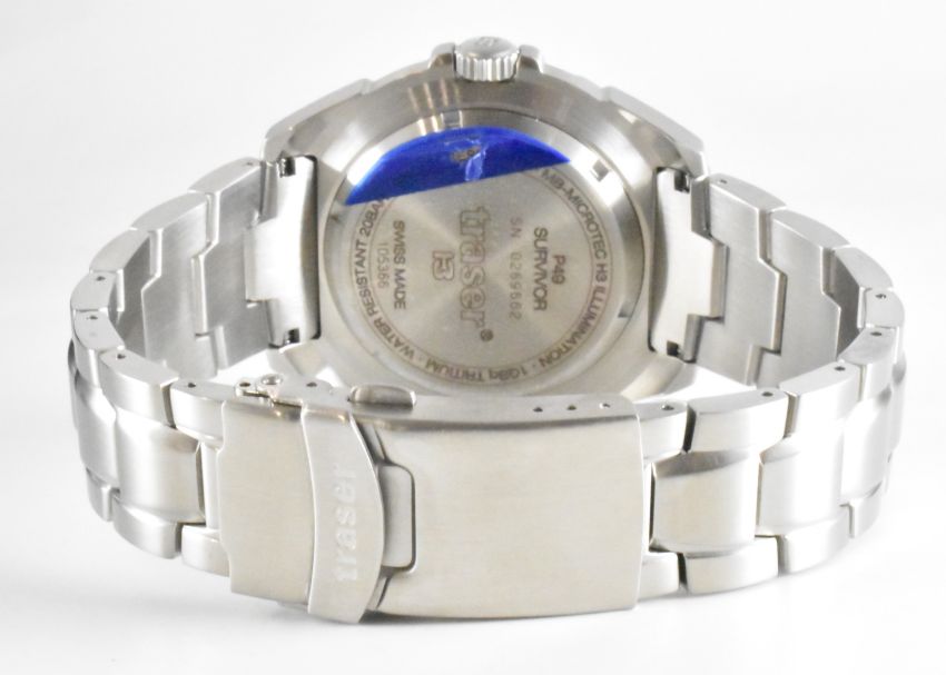 A gentleman's Traser survivor wrist watch. The watch having a round face with black dial, Arabic numerals to the chapter ring, date aperture to three and a rotating bezel. The watch has stainless steel case with a stainless steel strap. Case measures approximately 4.3cm diameter. In original box with paperwork.