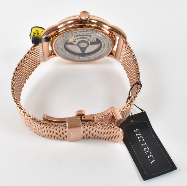 An Aviator gentleman's wrist watch with extra watch strap. The watch having a round face with baton numerals to the chapter ring and aperture at six. The watch set within a rose gold tone stainless steel case and strap. Case measures approximately 4.3cm diameter. In original box with instruction manual.