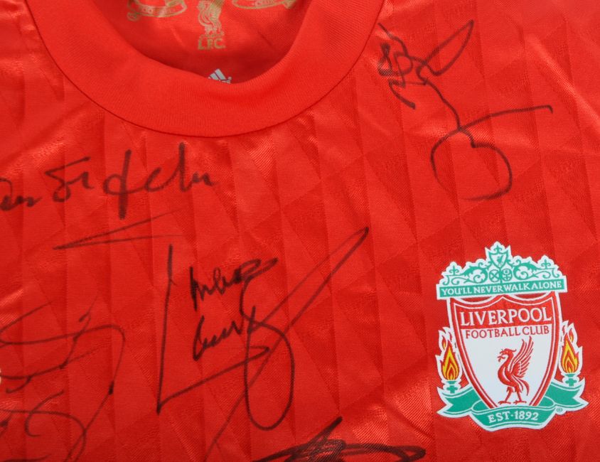 Liverpool Football Club - Two signed shirts, one being the 2010-12 red home shirt made by Adidas and containing multiple signatures to include Kevin Keegan and around twenty others, size XL in good condition and the second shirt a 2015-16 chequered New Balance made shirt, with a single signature, size large, in good condition and still having its store tags intact. Both sponsored by Standard Chartered.