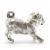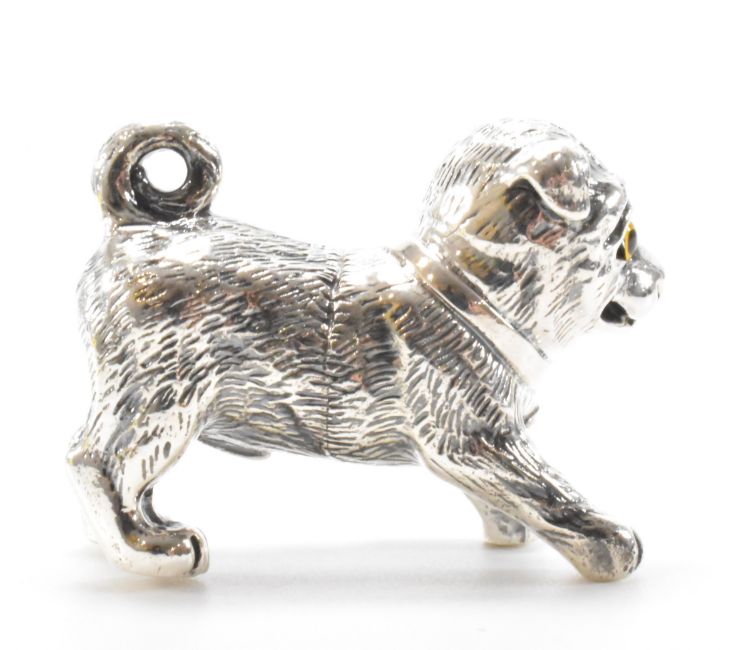 A silver figurine in the form of a pug dog. The pug having applied yellow eyes. Marked sterling 925. Weight 14.2g. Size 3cm wide.