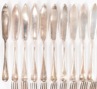 A Martin Hall & Co silver 12 person fish set cutlery canteen having 23 silver knives and forks (one fork missing). Hallmarked Sheffield 1918. Total weight approx 1005g. Housed within a fitted oak canteen.