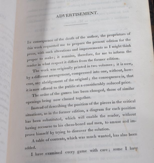 The Treatise on the Game of Chess: Containing A Regular System Of Attack And Defence. 1822. J H Sarratt. Published by Longman Hurst, Rees, Orme & Brown, London. Quarter leather bound, gilt letters to spine. Front and read marbled boards, continuing to endpapers and edging. Spine and boards heavily worn, spine is degrading, bumps and scratches to board, toning to text pages and slight foxing.