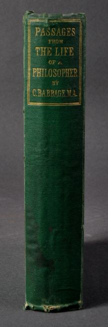 Passages From The Life Of A Philosopher - 1864 - Charles Babbage. Publisher: London: Longman, Green, Roberts, & Green. First edition book. 8vo. xii, 496 pp., bound without the publisher's catalogue sometimes found to the rear. Publisher's green cloth, gilt lettered to the spine, previous ownership bookplate to the front pastedown "Tho Sopwith MA FRS FGS. Occasional light foxing, very good condition.