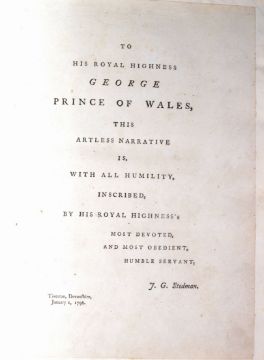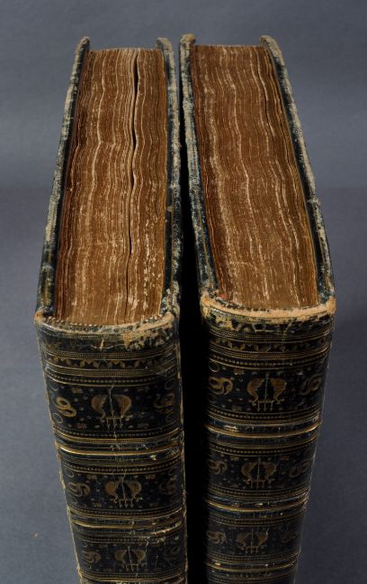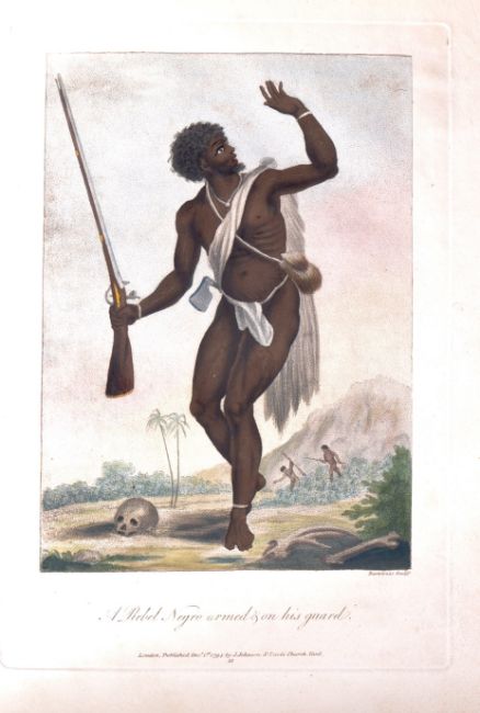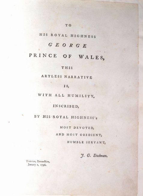 Narrative Of A Five Years' Expedition Against The Revolted Negroes Of Surinam, In Guiana, On The Wild Coast Of South America; From The Year 1772, to 1777. Elucidating The History Of That Country, And Describing Its Productions, Viz. Quadrupedes, Birds, Fishes, Reptiles, Trees, Shrubs, Fruits, & Roots; With An Account Of The Indians Of Guiana, & Negroes Of Guinea / By Captn. J.G. Stedman ; Illustrated With 80 Elegant Engravings From Drawings Made By The Author. 1806. J.G Stedman. London: J. Johnson and Thomas Payne,. Two volume book, 4° (256 x 230mm). Engraved titles with hand-coloured vignettes, 81 hand-coloured engraved plates and maps, some heightened with gum arabic, Three folding and one double-page, by William Blake, Bartolozzi and others after Stedman. Contemporary diced Russia gilt, boards with gilt borders, board-edges and turn-ins, modern calf spines, gilt in compartments, lettered in two, gilt edges, marbled endpapers. (Some light browning and off-setting from plates.)