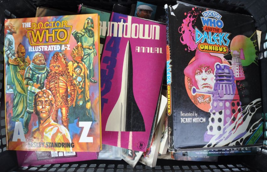 Doctor Who - a collection of assorted ' classic Who ' related publications - Doctor Who magazine, novelisations, guide books, ' Dr Who And The Daleks Omnibus ' annual, Illustrated A-Z, and others. Along with a near-complete set of Battles In Time trading cards in album, with some loose.