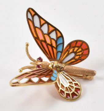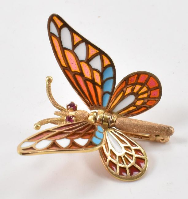 A vintage gold plique a jour enamelled butterfly brooch. The brooch having ruby set eyes with posable wings. Marked 8k spain to body. Measures 2.5cm. Weight 4.1g.