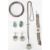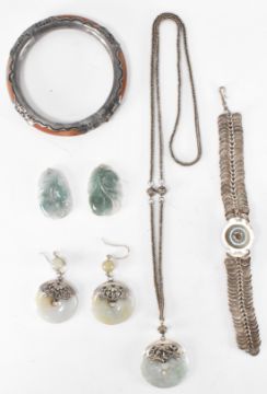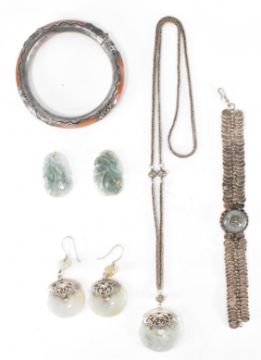 A selection of white metal and jade Chinese jewellery. The lot to include a wirework and jade bracelet, a pair of jade roundel earrings with matching pendant necklace, a carnelian silver collared bangle and two carved green stone pendants. All unmarked. Necklace chain measures 26 inches, bracelet measures 7 inches, earrings measure 2.8cm wide, bangle measures 18.5cm interior circumference.