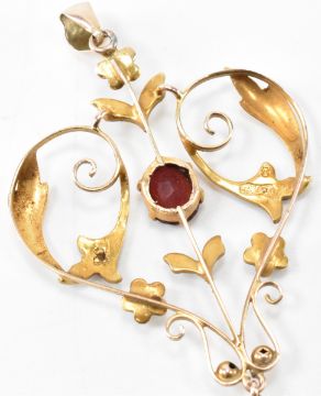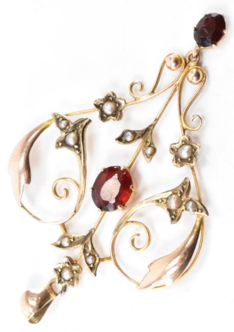 An early 20th Century 9ct gold Art Nouveau garnet and seed pearl pendant. The pendant of scrolled foliate form set with seed pearls set with red stones. The pendant marked 9ct to verso. Measures 5cm . Weight 2.2g.