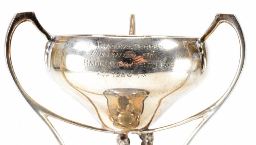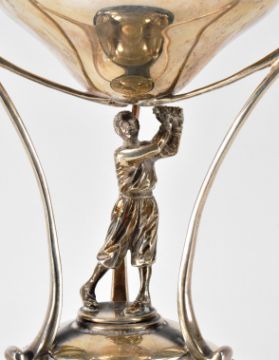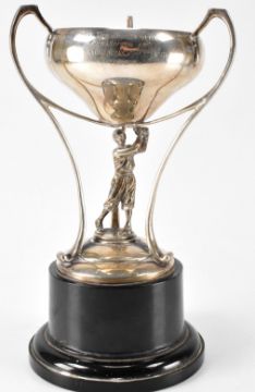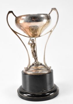 A hallmarked silver trophy with scrolled handles and cast silver figure beneath. Assay marked for Birmingham. Date letter l for 1965. Makers marks for Joseph Gloster. Inscription to the surface. Total weight 344g.