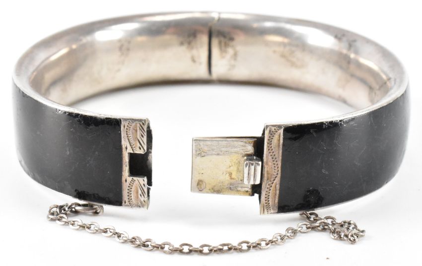 A Victorian 19th century black enamel and silver mourning bracelet. The bracelet being set with a series of seed pearls in a star formation surrounded by chased decoration. The clasp having a tongue and groove mechanism with incised decoration and being marked with Malta star silver mark. The inner band being marked Y O. Inner diameter measures approximately 60mm x 55mm. Total weight 26.5g.