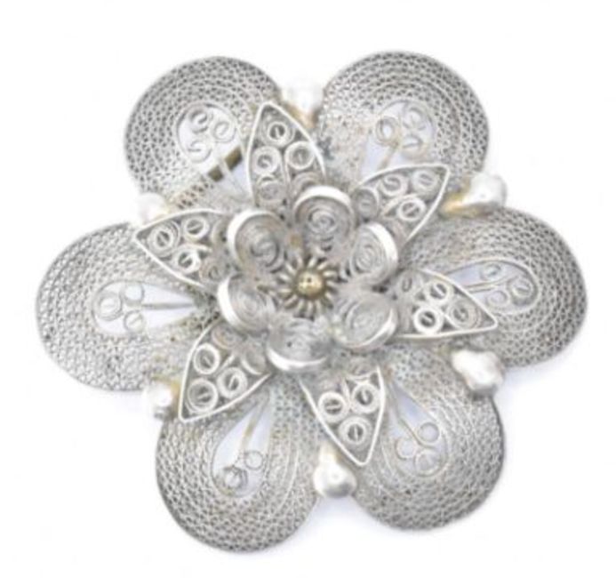 An assortment of silver filigree cannetille spun flower pendants. The collection having a variety of sizes and design and three pieces having additional lapel hooks to be worn as a brooch. Largest measures 55mm in diameter. Total weight 56g.
