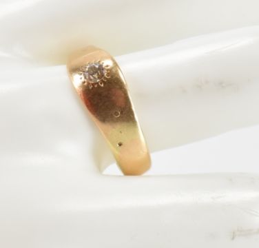 A gold and round old cut diamond gypsy ring. The ring testing 14ct gold and the central diamond measuring 3.4cm. Ring size W.5. It weighs 4.4 grams.