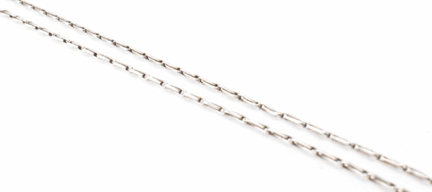 An early 20th Century Edwardian silver, diamond and amethyst pendant necklace. The necklace having a drop set with diamonds and a polished amethyst drop. Chain measures 20 inches. Weight 6.0g. Drop measures 3.8cm.