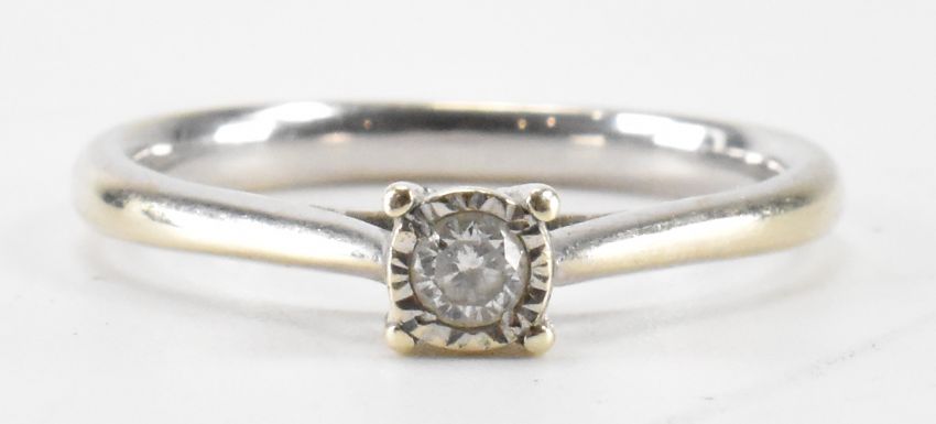 A hallmarked 9ct white gold and diamond solitaire ring. The ring being set with a round brilliant cut diamond in a square setting on a plain band. Hallmarked London. Weight 2.3g. Size L.5.