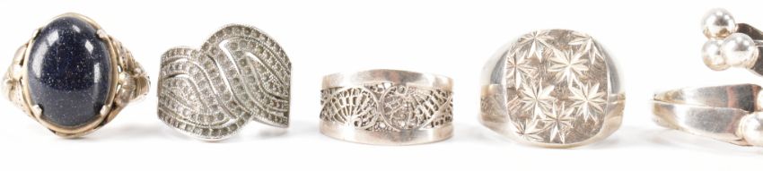 A collection of 8 925 silver rings. The rings to include bluestone, CZ, 1 American Dime, signet. Total weight  38.5g. Sizes range H - R.