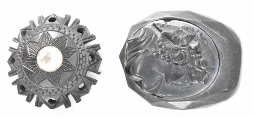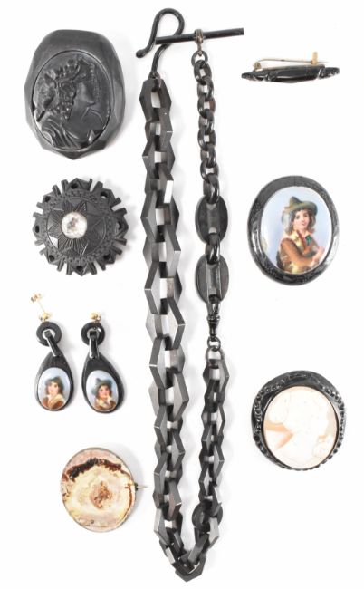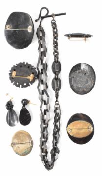 A collection of Victorian and later mourning jewellery to include a vulcanite albert watch chain, cameo brooch pins and earrings. Watch chain measures approx 19 inches. Largest brooch 5cms.