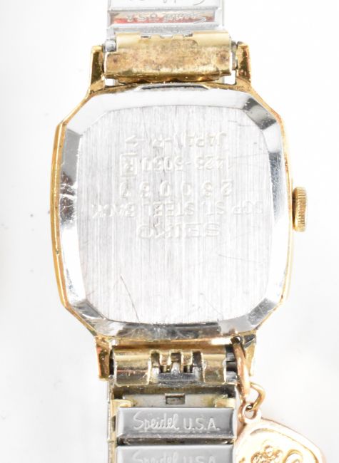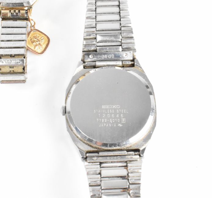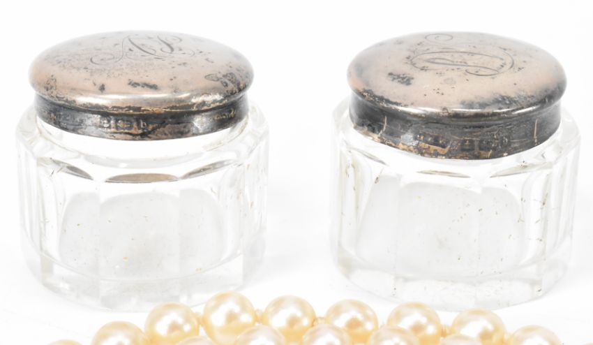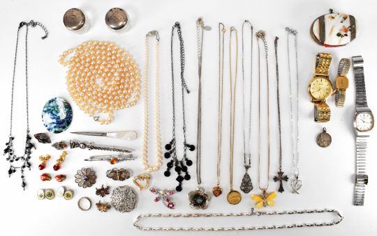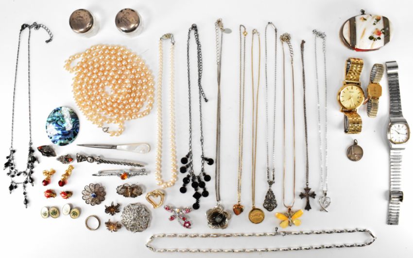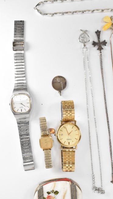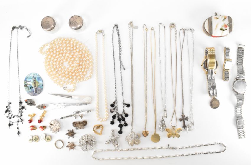A collection of costume jewellery, watches and silver. The lot to include two silver topped dressing table pot (both hallmarked), simulated pearl necklaces, three Seiko watches, pendant necklaces, a silver and 9ct gold eternity ring (hallmarked Birmingham 1976, size N).