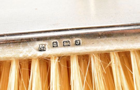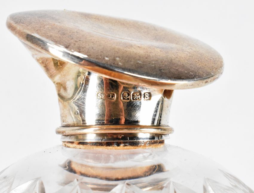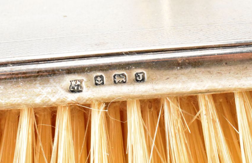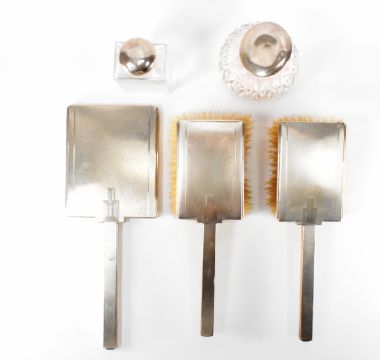 A silver hallmarked Art Deco dressing table set. The set having engine turned details with geometric detailing (hallmarked Birmingham 1933), a rectangular bottle with silver white metal top (tests indicate silver), and a globular cut glass bottle with silver top (hallmarked Birmingham 1917). Mirror measures 29cm. Weight 30.9g.