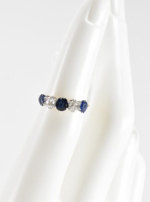 An 18ct gold sapphire and diamond five stone ring. The ring being set with two round cut diamonds and three round cut sapphires. Diamonds estimated 0.80ct in total. Weight 2.1g. Size J.5. Central sapphire measures 4.3mm.