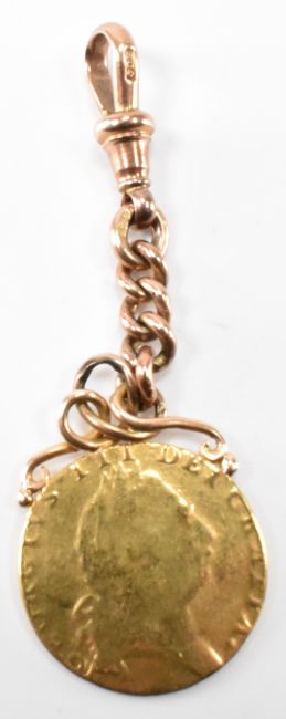 A 18th Century George III gold spade guinea coin mounted on a 9ct gold chain and swivel fob. The chain marked 9ct gold, swivel marked CDB. Total weight 13.6g. Coin measures 24mm.
