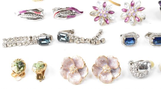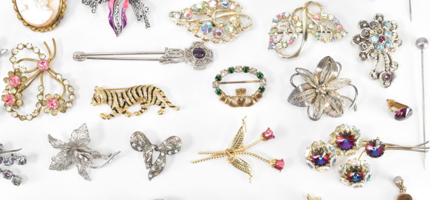 An assortment of vintage brooches and clip on earrings. The lot to include rhinestone, enamelled, filigree a leopard brooch and more. Enamel and marcasite flower brooch measures 5cm wide.