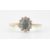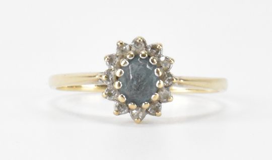 A hallmarked 9ct gold topaz and diamond halo ring. The ring being set with an oval cut blue topaz with a halo of round cut diamond surrounding it. Hallmarked Birmingham 1989. Weight 1.5g. Size K.5.