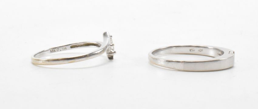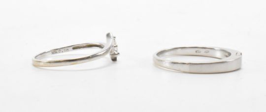 Two white gold and diamond rings. The lot to include a hallmarked 18ct white gold crossover ring set with a square cut diamond (assay marked Birmingham 750, size L.5) and a white gold band ring channel set with a square cut diamond (marked 750, tests indicate 18ct gold, size L). Weight 3.8g.