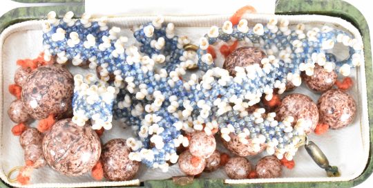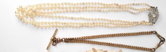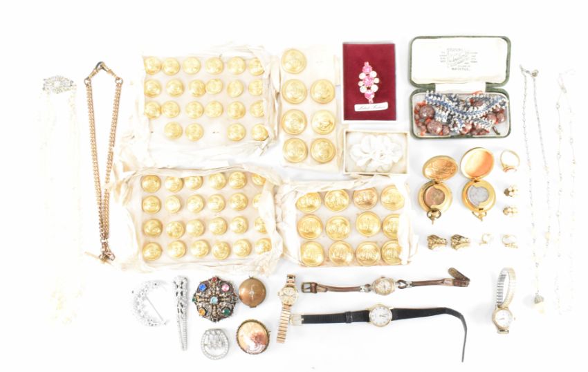 A collection of vintage costume jewellery and watches. The lot to include a gold plated pocket watch chain, Art Deco dress clips, brooches, glass beaded necklace, faux pearl necklaces, sovereign cases, beaded necklaces, clip on earrings, ladies cocktail watches and crucifix pendants.