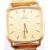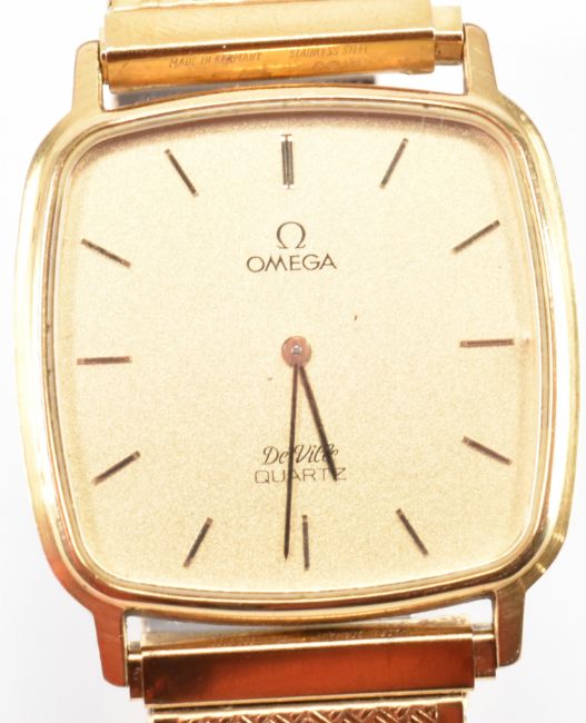 An Omega DeVille Quartz wrist watch with gold face and numerals. Rom German made strap. Back of case marked 1365. Face measures 30mm x 30mm.