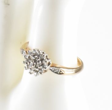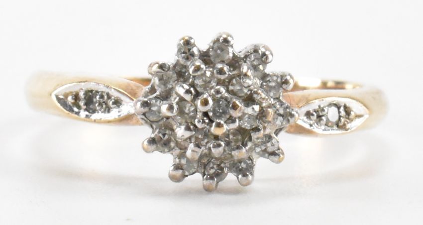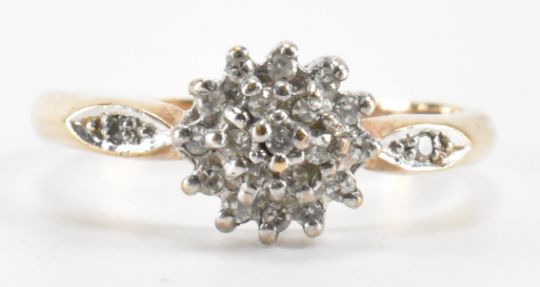 A hallmarked 9ct gold and diamond cluster ring. The ring having a cluster of round cut diamonds to the head with further diamond accents to the shoulders. Import marked for London. Weight 2.1g. Size L.
