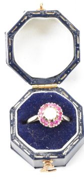 A hallmarked 9ct gold opal and ruby dress ring. The ring being set with a central round opal cabochon with a halo of round cut rubies. Hallmarked London 1964. Weight 2.3g. Size J. Opal measures 4.8mm.