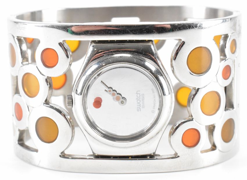An assortment of three vintage 20th century Swatch Swiss wrist watches to include a Swatch stainless steel cuff wristwatch, a 1980's Swatch quartz wrist watch model S547 and another  stainless steel and enamel ladies Swatch wristwatch. Measures 21cm length.