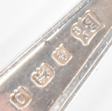 An assortment of silver hallmarked flat ware items to include a hallmarked silver pusher. Assay marked for Birmingham. Date letter n  for 1912. A  John Rose napkin holder with engraved initials circa. 1930's. A set of five Edwardian hallmarked silver teaspoons. Assay marked for Birmingham. Date letter e for 1904. Makers marks for A. J. Bailey. Together with a set of six hallmarked silver handled butter knives. Several pieces being in original display boxes. Measures 15cm in length. Total weight 231g. LOT 424