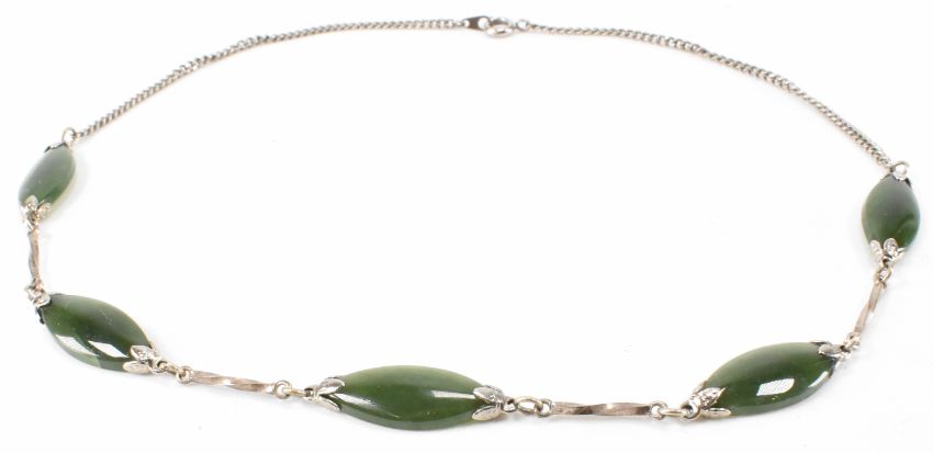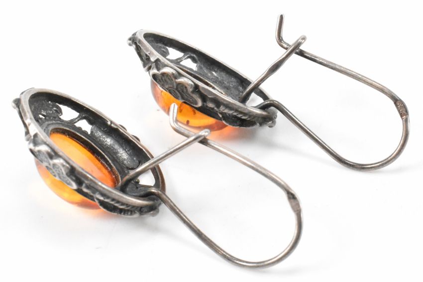 A collection of silver jewellery to include a pair of drop amber & floral earrings marked 925. A pair of amber stud earrings marked 925. Also a nephrite & chain necklace unmarked however tests indicate silver (chain measures; 41cm).Weight approx; 20.4 grams.