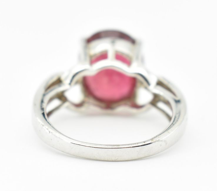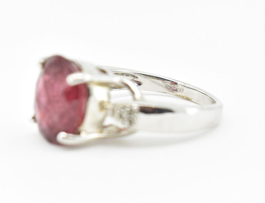 A hallmarked 9ct white gold tourmaline and diamond ring. The ring set with a mixed chequered cut tourmaline having diamond set shoulders to plain shank. Weight 5.9g. Size N.5.