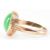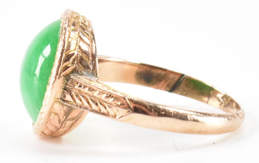 A vintage gold and jade cabochon ring. The ring being set with an oval polished jade cabochon with incised detailing to the head and shoulders. Unmarked tests indicate 9ct gold. Weight 4.3g. Size M.
