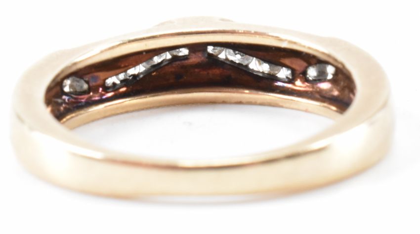 A hallmarked 9ct gold and diamond band ring. The ring set with 12 round brilliant cut diamonds to a tapering band. Import mark Sheffield. Sponsor AG. Estimated total diamond weight 0.14ct. Weight 3.43 g. Size K.5.