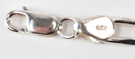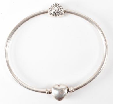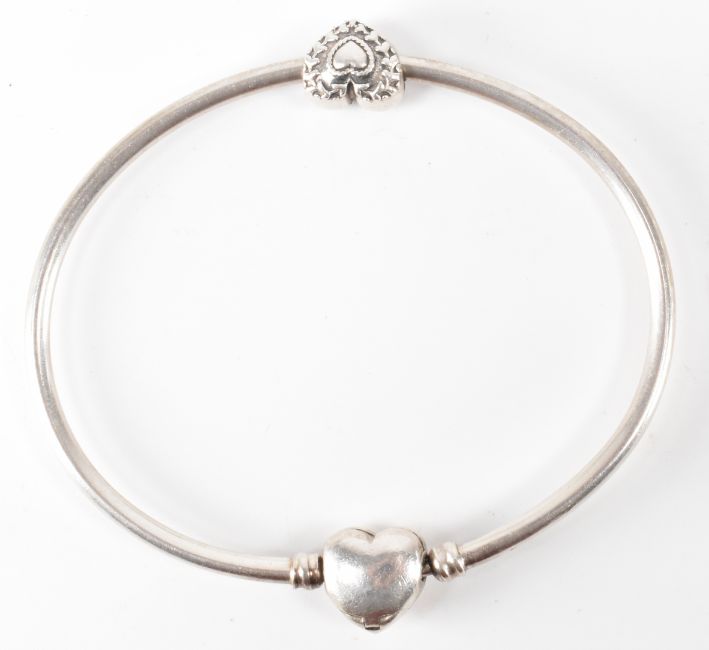 Collection of  925 silver bracelets & bangle to include, Chamilia heart bangle, simulated pearl and silver bracelet 20cm, a Camilia bracelet 19cm, and a hallmarked silver figaro chain bracelet - 19cm. Total weight 49.26g.