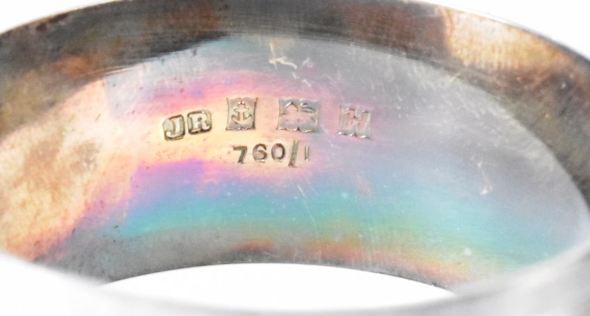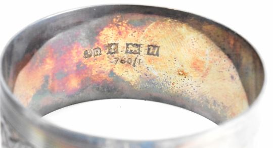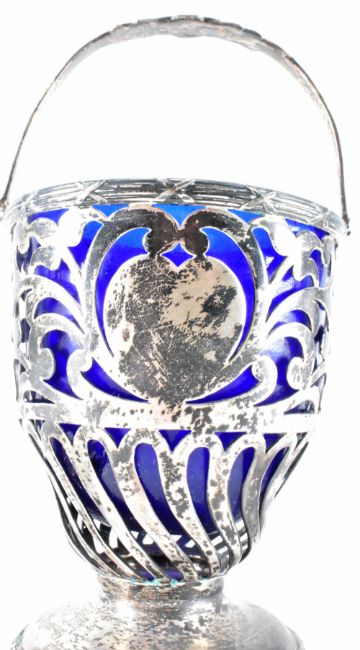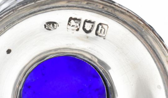 A silver hallmarked basket / bon bon bowl with pierced sides raised on a footed base with a swing handle to top and blue glass liner. Hallmarked London 1903, with makers marks for Frederick Augustus Burridge. Together with a pair of silver hallmarked napkin rings, hallmarked Birmingham 1957. Silver weight 166.0g.