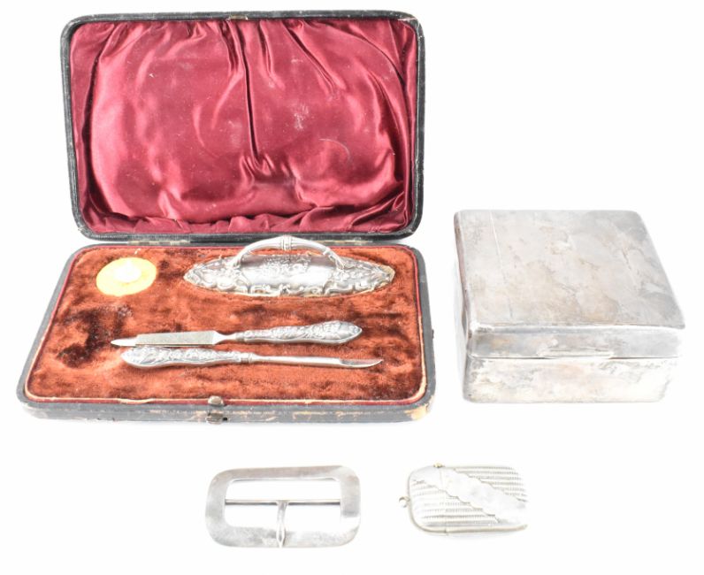 A collection of silver items to include a silver trinket box hallmarked Birmingham 1932 Measures 8cmX9cmX4.2cm. A silver buckle hallmarked London 1913. A plated vesta case. A cased partial silver manicure set, hallmarked Birmingham 1903 Adie & Lovekin Ltd.