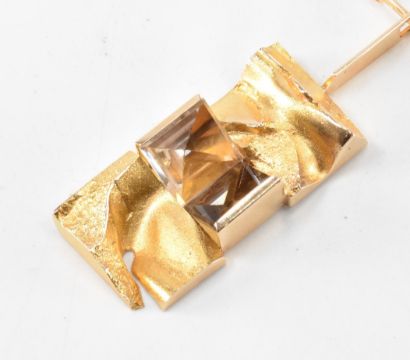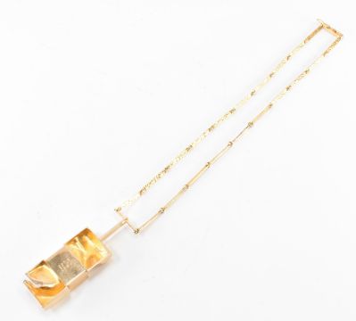 A 1970s Bjorn Weckstrom Finnish 14ct gold designer necklace. The modernist necklace set with smokey and clear quartz panels in a brutalist gold pendant mount on a textured bark link chain. BW makers marks to the verso of the pendant, marked Finland with date mark R7. Chain measures 18 inches, pendant measures 4.5cm. Weight 30.5g.