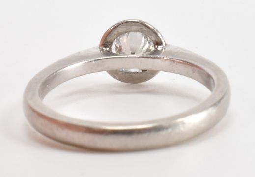 A hallmarked platinum and diamond solitaire ring. The ring set with a single round brilliant cut diamond estimated diamond weight 0.80ct. Weight 5g. Size M.5
