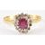A hallmarked 18ct gold ruby and diamond ring. The ring being set with an oval cut ruby with a halo of round cut diamonds. Hallmarked Birmingham 1982. Weight 2.5g. Size Q.5. Ruby measures 6.4 x 5.0mm. Weight 2.5g. Size Q. Diamond missing.