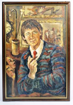Corinna Button - Contemporary British Artist - A 1980's acrylic on canvas portrait painting of a gentleman seated holding a cigar. The the back drop further paintings of figures with face masks to the left with stick stand and clock above. Signed to the lower right and dated 1980. Set within a ok frame. Measures approx; 100cm x 68cm.
