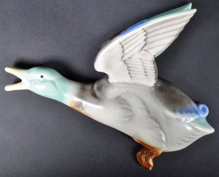 Poole Pottery - John Adams - A graduating set of three vintage 20th Century Art Deco studio art pottery wall plaques in the form of flying Mallard ducks. Each with wide open wingspan and hand painted features. Impressed makers marks to the versos. Largest measures approx; 22cm x 30cm.