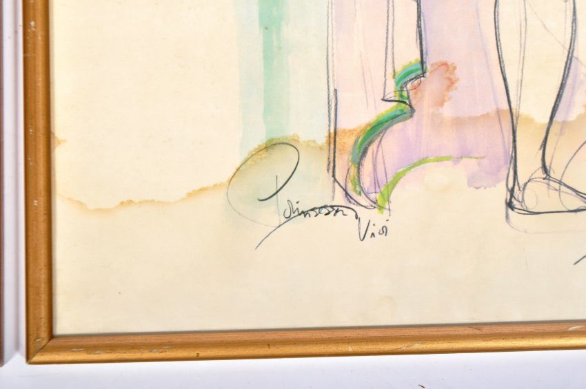 After Bjørn Wiinblad (b. 1918-2006) - A collection three retro mid 20th Century Danish framed and glazed prints in colours with each depicting classical figures with notes and sketches throughout. Each signed in plate with printmakers to the bottom right. Damage to the glass on one of the print. Each measures approx; 65cm x 45cm.