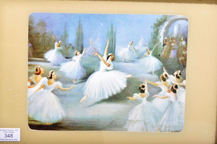 A retro mid Century 1950's two tier folding cake / afternoon tea serving tray stand having two tiers with glass tops and central ballet scenes. Bronze and cream wrapped plastic decoration to the frame with all raised and supported on trestle feet. Measures approx when open; 75cm x 45cm x 27cm.
